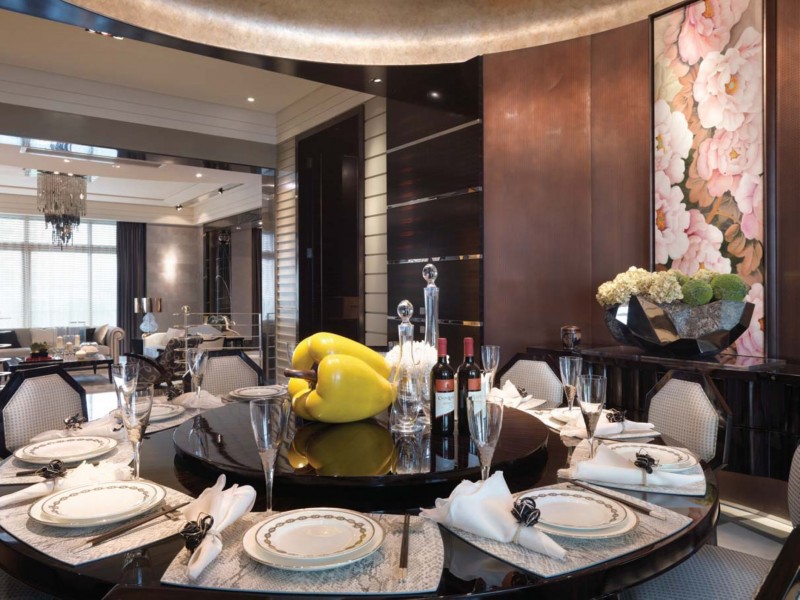 轮廓线条简洁,咋看一下,只是普通的十人餐桌。但是走进一看,细细品味中,许多细节又是耐人寻味。黑色餐桌上玉黄的太阳光线,高低旋转台的客制化设计,配搭上铁青花边的陶瓷餐具,新中式的崭新新貌在低调奢华中回归。
