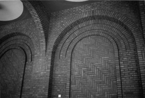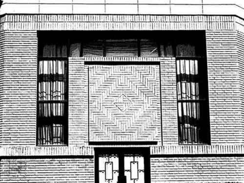 关先生主持的图书馆的第二次扩建,注意了与以往的建筑的协调和文脉的延续。首先,他将砖砌的拱券发挥到极致。在二校门和清华学堂的入口以及二教的窗洞上均为拱券,大礼堂北立面上部还有一巨大的砖发券直到顶部,老图书馆的窗洞已经是三层退迭的砖券了。在新图书馆与老图书馆交接的部分,做了连续券廊。券廊内部的墙面上、门洞顶部和假窗部分的墙面砌筑图案明显延续了大礼堂和一号楼、新斋的墙面的砌筑图案,分别见图10一11。