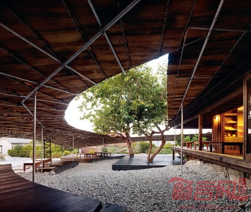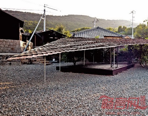 岛艺术餐厅是一个富有创新性的项目,它把丰岛某山村中一处闲置的房屋改造为艺术空间和餐厅。这幢旧宅周边有几处空地,都是很久以前拆除了其他房屋之后留下的,并且还剩下一座旧仓库和两棵柿子树。设计者将这处旧宅改造成了开放的厨房,并把仓库改装为艺术画廊,遮阳顶篷围绕着两棵枣树延伸,形成了室外剧场的空间。