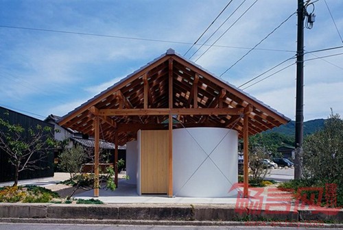 设计团队在当地的“place of sauce”(hishio-no-sato)设计了一个公共卫生间装置——这个基地是用来生产酱油的,人们用传统的配方生产原汁原味的酱油。建筑师将这一历史区块作为设计的起始点,木制结构的屋顶下方是一个更加精细的、曲线形墙面,这一形式暗指老酱油仓库中的圆形木桶。屋顶结合了烟色玻璃和玻璃砖两种不同材料,创造了一个与当地乡村环境相契合的形式美学。