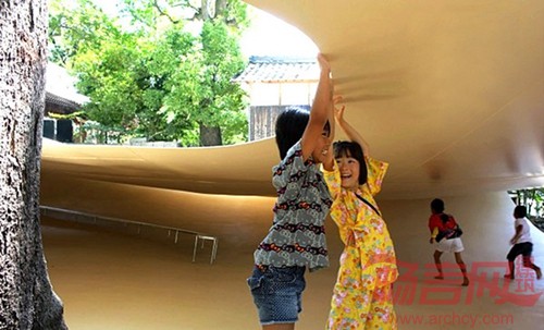 福武之家的“亚洲艺术交流平台”,邀请台湾、香港、泰国、新加坡、印尼、韩国、澳洲等七国,以“亚洲如何面对全球化”为题创作,将闲置的小学教室转化为展场。西泽立卫在小学和古老的神社之间打造了有两片弧形钢板集合而成的露天休憩区。作品没有使用任何一根柱子,也没有任何一棵树木受到伤害,低调而自然地隐身于大自然中间。