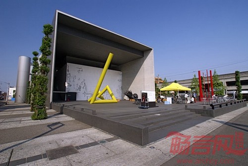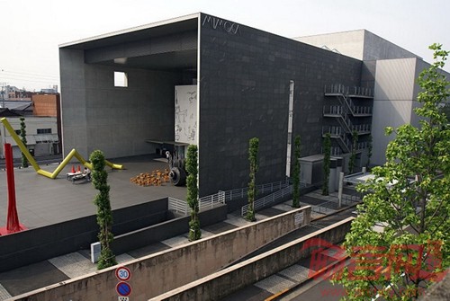 美术馆水泥色的建筑框体展现了美术馆开放的态度,正面配置了巨大的壁画及雕塑品,纯白的大理石壁画上有涂鸦似的黑色绘图,作为前方红黑黄三色现代艺术品的背景。