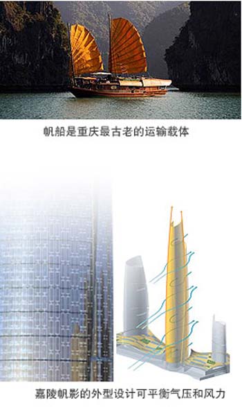 “嘉陵帆影”位于渝中区化龙桥,形似一叶扬帆屹立嘉陵江畔,投资约80亿人民币,预计2015年整体竣工。建筑高度将达到455米,在世界在建或建成高楼中位居第七;人可到达楼面高度逾440米,将超越著名的台北101大楼(人可到达楼面为439.3米)、马来西亚双子塔、上海金茂大厦等现有国际知名超高层建筑,全球排名第六。