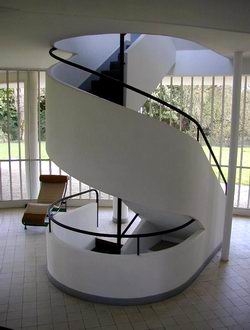 现代建筑认为空间是建筑的“主角”,并在实践中特别注重空间的组织与塑造,使建筑空间在技术飞跃的基础上产生了巨大的发展。建筑的内部空间设计,已从传统的静态空间,逐渐发展到现代建筑的动态空间,即“空间——时间”的概念,在传统三维空间上增添了人在其中连续位移而产生的时间因素,因而使建筑空间表现出 更多的自由、变化和丰富。萨伏伊别墅就是一个“空间——时间”营造的典范。别墅采用开放式的室内空间设计,动态的、非传统的空间组织形式,尤其使用螺旋形的楼梯和坡道来组织空间。并没有用豪华的材料,没有附加的装饰,纯粹由建筑的基本构成元素及其材料来组织和塑造丰富的动态空间,这绝不仅仅是顺应了当时窘 迫的经济状况,而更主要是当时重视功能、强调空间、反对附加装饰的现代建筑设计思想的反映。