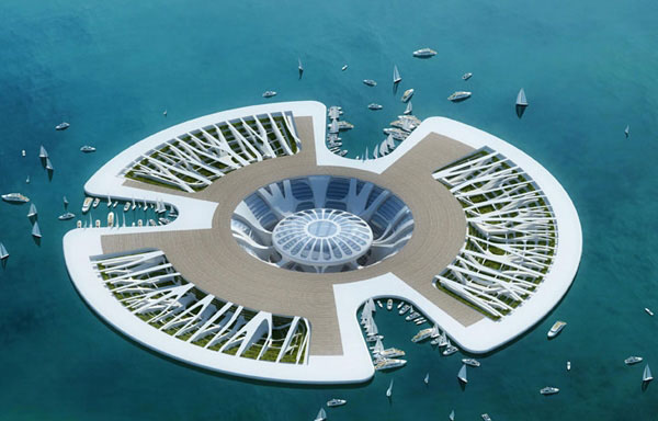 随着全球变暖,海平面的上升已是无法掩饰的事实。未来,将会有越来越多的地区会面临海平面上升的威胁。有极少数城市设计是关于因全球暖化而导致的涨潮使人们流离失所的解决方案。当然也没有一个像这个一样壮观,这个由Vincent Callebaut设计的Lilypad是为遭受未来气候改变的难民提供的一个完全自给自足的漂流避难城市。这个概念的目的是值得赞扬的,而且Callebaut的非凡设计已经超越了我们的想象。Lilypad是为未来2100年设计的人工岛屿,Lilypad人工岛屿将漂泊在赤道两极的海洋之中,大约可容纳5万人正常生活。它是一个两栖城市,也可以看做是一个巨大的船只。仿生学无疑是这个设计背后的灵感,被设计成水莲花的Lilupad是被设定为一个漂流在海上没有排放污染的城市。通过许多技术(太阳能、风能、潮汐能、生物技术),它设想整个项目不仅可以制造自己的能量,而且可以在大气里处理二氧化碳并且把它吸收进它的二氧化钛的表皮。每个这些漂流的城市被设计成一个人造的复合型地面风景以一个人造淡水湖和三个山脊组成,创造出适合不同居民的各种各样的环境。每个Lilypad可以靠近海岸也可以在海洋中漂流,根据海潮的力量从赤道向北部海域进行旅行。