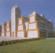(1)马尔堡城市住宅方案(1976)该住宅位于一历史地段。建筑用地近方形,但在一个角上有一幢该城市历史最悠久的建筑。翁氏这件作品最著名的是,它的一系列的设计过程以及其中采纳的类型学思想。翁氏在这件作品中充分地使用类型学探索建筑的可能性。首先他对大量形态各异的类型进行型态研究,最后确定了一个“L”形构型。该L型是由五个立方体构成。该五个立方体构成了这幢建筑的“基形”即固定要素。基本结构确定后,他转而研究和设计低一个层次的内容,即整体中的各体部件(要素)。在这里,他对组成L型的立方体进行设计。他设计了不下十种立方体构形。随后他选择不同的立方体构形置于网格中,得到不同的构型和形态,由此产生了“变体”。