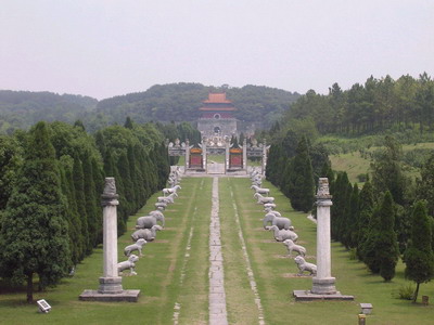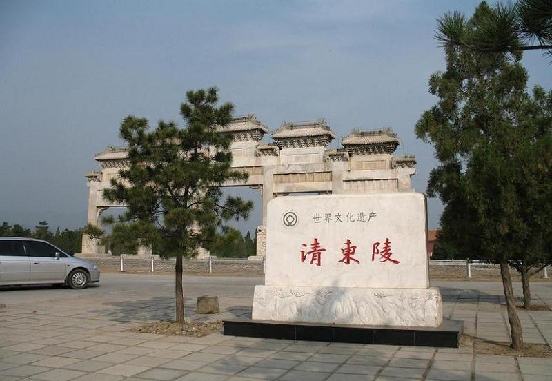 清东陵入口处的文物保护碑清东陵坐落在河北省唐山市的遵化市境,西距北京市区125公里,据说是顺治到此打猎时选定的,康熙2年(1663年)开始修建。陵区南北长125公里、宽20公里,四面环山,正南烟炖、天台两山对峙,形戌宽仅50公尺 的谷口,俗称龙门口。清代在此陆续建成217座宫殿牌楼,组成大小15座陵园,诸陵园以顺治的孝陵为中心,排列于昌瑞山南麓,均由宫墙、隆恩门、隆恩殿、配殿、方城明楼及宝顶等建筑构成。其中方城明楼为 各陵园最高的建筑物,内立石碑,碑上以汉、满、蒙三种文字刻写墓主的谧号;明楼之後为"宝顶"(大坟头),其下方是停放灵柩的"地宫"。由陵区最南端的石牌坊向北到孝陵宝顶,由一条约12公尺宽、6公里长的神道连成一气,沿途大红门、大碑楼(圣德神功碑楼)、石像生、龙凤门、七孔桥、小碑楼(神道碑楼)、隆恩门、隆恩殿、方城明楼等建筑井然有序,主次分明。