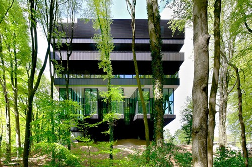 在荷兰东部阿纳姆的森林中,一块安静的用地上屹立着这座疗养院。虽然这个14000平方米的建筑占地面积不大,但是通过悬挑获得了足够的空间,铝金色的外皮与自然环境也相当搭。通透的玻璃与环境的无缝连接。森林触手可及无处不在,对建筑中的人形成强烈吸引。疗养院也是公园总体规划的一部分。一二层可以理解成一个公共景观。