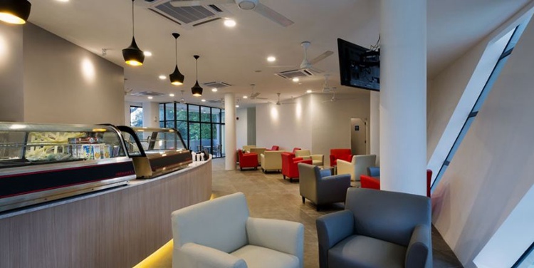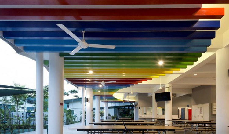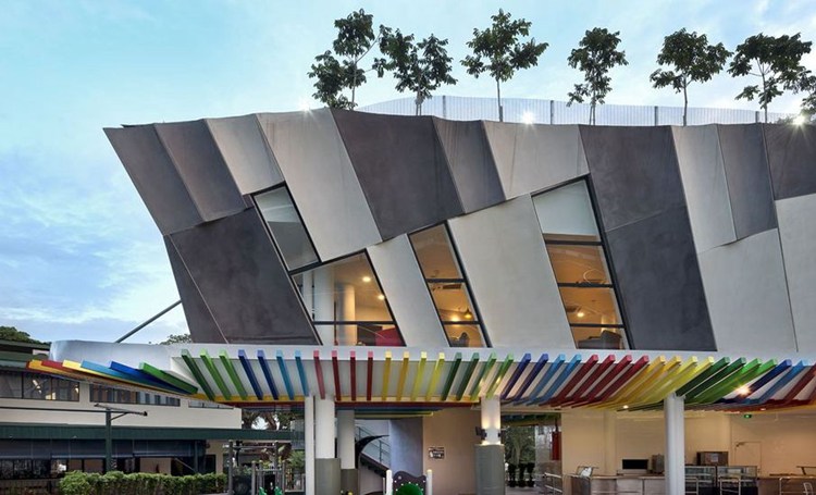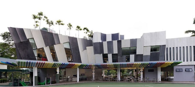 该建筑包括地面上一个带顶露天自助餐厅,能够容纳200名孩子就餐,由一个工业化厨房提供服务,代替了现有的熟食店,为校园提供平衡的餐饮。东边有一个下沉式游乐场地是该建筑的垂直流通堆叠区,由楼梯和电梯连接地下和地上部分。在二楼,建筑容纳了家长熟食店,还有一些其它与家长有关的设施,例如行政办公室、运输办公室、家庭教师学会会议室、统一商店和洗手间。