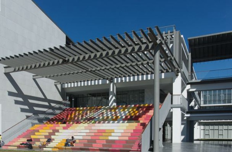 分层的外观结构体系能够对周边产生吸引力。玻璃幕墙和窗户是交替的白色色调,由铝板挤压出的细纱板材,交错和有节奏的石板以及外部木材面板用来调节来自太阳的光和热,产生不断变化的色调和阴影,为城市的快乐氛围增添了视觉深度和美感。