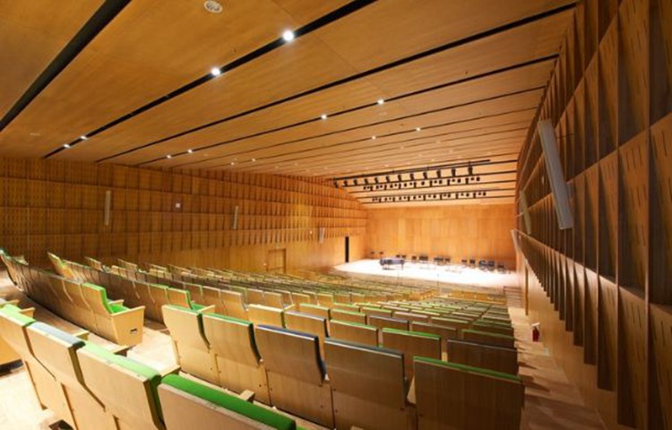 鞋盒子形状的礼堂能容纳400人。当学生需要排练时,一个大型推拉门可以扩展后台区域,包括相邻的音乐教室。这也让音乐教室成为辅助后台空间,以支持更大的作品。吸音窗帘隐藏在观众席的的两侧,声学木板后面。在戏剧表演和一些讲座时这些窗帘可以关闭以吸收声音,并提供清晰的音响效果。对于演唱会,这些窗帘可以打开增加混响时间,以产生良好的音质。