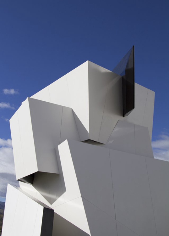 柏林犹太博物馆从空中鸟瞰是一系列长方体建筑连贯而成的曲折锯齿形线条,凸起尖尖的锐角,幅宽被强制压缩,像扭曲的生命充满痛苦和悲伤。中间一组空白地带排成的直线,将曲线一分为二,象征欧洲犹太人苦难史上难以磨灭的空白。博物馆内外充满破碎和不规则的元素,堆积成伤痕累累的民族悲情,诉说两千年来犹太人和德国人难以厘清的因果关系。