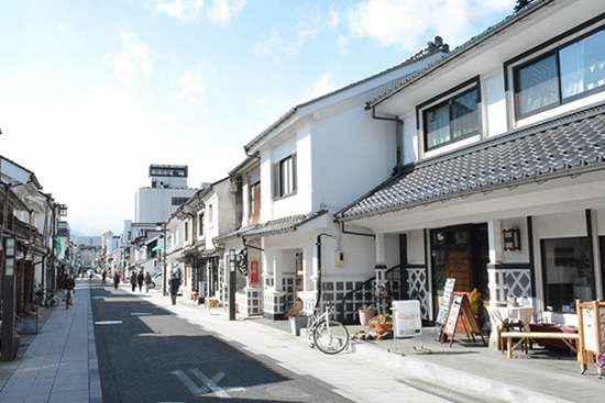 隔着女鸟羽川,与中町大街的仓房建筑景观相对的是再现了城下町景观的绳手大街。1967年,这里开始祭祀青蛙大明神,青蛙的发音在日语中与“回来”相同,祭祀青蛙含有希望再次恢复活力的含义,这里也成为市民和游客小憩之地。