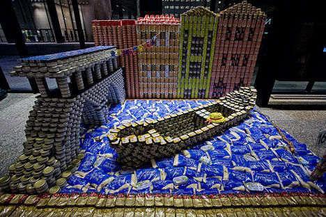 当你还是孩子时,你可能还记得在学校将罐头食品堆成摩登塔,但这远没有此罐头建筑那么令人印象深刻。加拿大多伦多大学的学生和专业建筑师组成的团队,用罐头设计和建造了商行和公司,酷似儿童课本上的插图。此外,他们还设计和建造了城市风景、树木、蜜蜂甚至积木搭建的人。