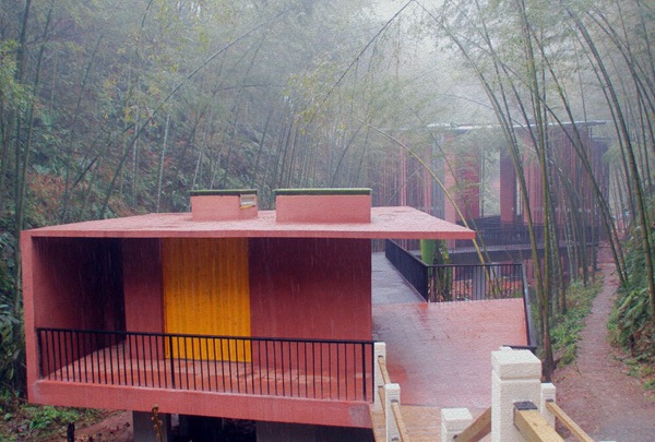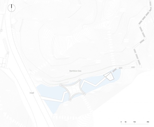 入口建筑被西线工作室设计成一组类似于竹海的密集的线条集,由此巧妙地藏在竹海中,同时并通过对外部气候条件(阳光,雾,风雨和雪等)的蓄意控制,产生出不确定性与变幻性共存的状态;入口建筑正是以这种若隐若现的方式,制造出一种具有特殊质感的公园入口。