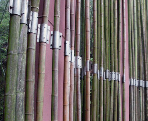 建筑以钢筋混凝土空腔作为支撑体系,顶板以挂钩的方式将一群截面直径在10CM左右、长约11M的竹竿群悬挂其下,虽然顶板+天面玻璃对竹筒群的避雨有一定作用,但竹海湿度大,温差大,竹杆在这样的条件下,耐候性是必须重点考虑的因素,同时由于竹体内的油系糖水混合物,各类微生物寄生体需用“蒸”的方式排出,否则很容易导致竹腐烂;但当地设备只能蒸煮长度在6m内的竹竿,于是11m的吊挂高度转化为上下两截各近5.5m高的竹,二者以手工打造的环形金属件垂直连接。