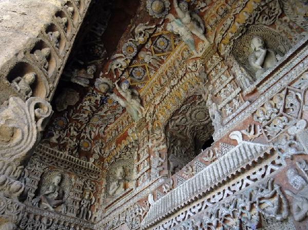 第九窟,分前后两室,前室门拱两柱为八角形,室壁上刻有佛龛、乐伎、舞伎,造像生动,动感强。