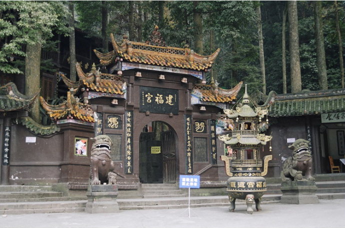青城山是中国道教的重要发祥地。全山的道教宫观以天师洞为核心,包括建福宫、上清宫、祖师殿、圆明宫、老君阁、玉清宫、朝阳洞等10余座。建福宫建于唐开元十八年(公元730年),现存建筑为清代光绪年间 (公元1888年)重建。现有大殿三重,分别奉祀道教名人和诸神,殿内柱上的394字的对联,被赞为“青城一绝”。天然图画坊位于龙居山牌坊岗的山脊上,是一座十角重檐式的亭阁,建于清光绪(公元1875~1909年)年间。这里风景优美,游人到此仿佛置身画中,故将其称为“天然图画”。