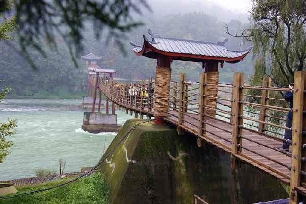 安澜索桥 又名“安澜桥”、“夫妻桥”。始建于宋代以前。位于都江堰鱼嘴之上,被誉为“中国古代五大桥梁”,是都江堰最具特征的景观。索桥以木排石墩承托,用粗竹缆横挂江面,上铺木板为桥面,两旁以竹索为栏,全长约500米。明末(公元17世纪)毁于战火。现在的桥为钢索混凝土桩。