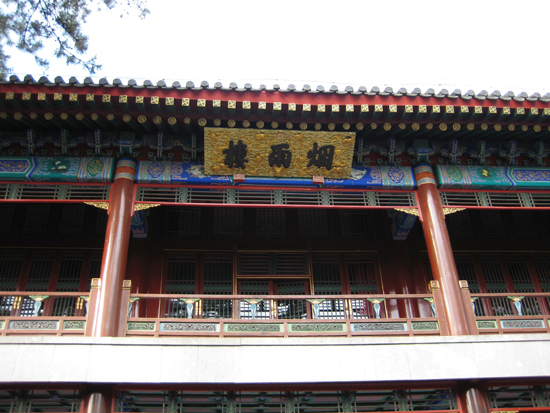 宫殿区位于山庄南部,宫室建筑林立,布局严整,是紫禁城的缩影。包括正宫、松鹤斋、万壑松风和东宫四组建筑。正宫是清代皇帝在山庄时,处理政务、休息和举行重大典礼的地方;松鹤斋寓意“松鹤延年”,供太后居住,建于乾隆年间;万壑松风是清帝批阅奏章和读书处,是宫殿区与湖区的过渡建筑,造型与颐和园的谐趣园类似;东宫在宫殿区最东面,原为清帝举行庆宴大典的场所,后毁于战火。烟波致爽殿:万岁照房北行过门殿,再北有殿七楹,进深两间,名烟波致爽,是正宫后寝部分的主殿,也是清帝在山庄的寝宫。康熙称这里“地既高敞,气亦清朗”,“四周秀岭,十里平湖,致有爽气”,故名烟波致爽,并列为避暑山庄康熙三十六景之首。四知书屋:原名依清旷,是清帝上朝、退朝途中,停留休息,更换朝服的地方,也是清帝作为一种破格待遇,接见亲信大臣和少数民族王公首领的场所。所谓四知,是知柔、知刚、知显、知藏,这是封建统治权术的概括和总结,乾隆曾在此处接见过六世班禅和土尔扈特蒙古首领渥巴锡。