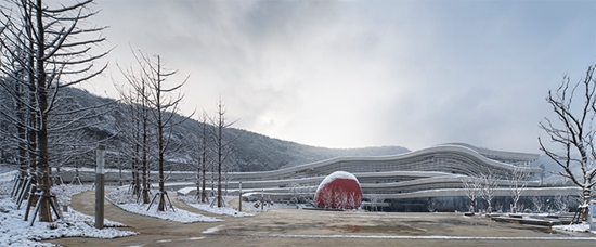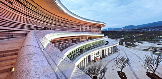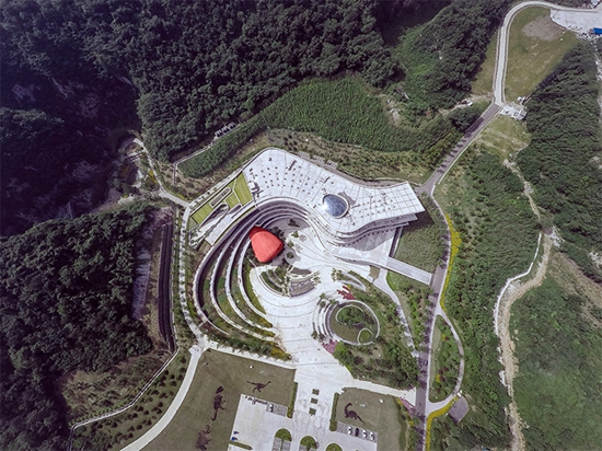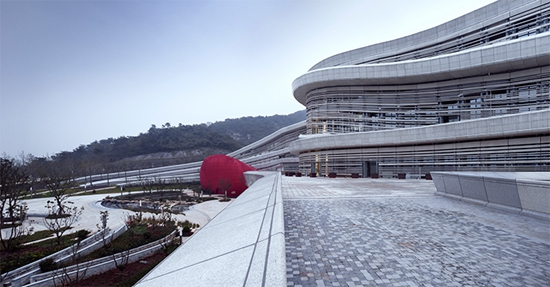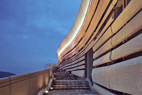 在立面处理上GRC水平构件所形成的丰富变化的肌理,也似乎在还原地貌亿万年的变化所塑造成的不同地质年代沉积的痕迹。在具体处理上采用玻璃纤维强化混凝土(Glassfiber Reinforced Concrete)和天然石材两种材料为主,GRC板材表面处理成类似斧凿石材表面肌理,色调则在对比附近山体颜色的色彩,经过多次反复尝试最后确定接近场地山体的色调。作为工业化材料的GRC具有很强的可塑性和适应性,既能够出色的满足建筑多方向曲面造型的要求,同时还能够匹配天然石材所具备的对环境的敏感和细腻的特点,在建筑材料的选择上也力图保持人工与自然之间精妙的平衡。