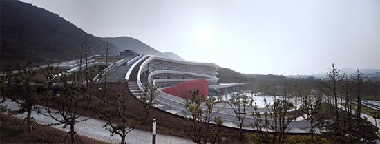 博物馆的核心设计理念来源于建筑所坐落的场地,一个废弃的依山而立的旧窑厂。废墟般的挡墙和其后叠嶂起伏的山峦赋予建筑形态创作的灵感,整个建筑借用地貌学的概念,在此通过引入一系列人工等高线的概念来构筑一个经过抽象过的人工地貌,似乎尝试复原被砖窑厂所改变的原始地形。一系列起伏、流动的线条仿佛从地面上生长出来似的,它们仿佛将千百年来地貌的运动、变迁,地层的摩擦、碰撞、破裂、挤压与移动的瞬间凝固下来一样。当人们凝视着这座流畅变幻,充满浪漫动态的建筑形态,似乎在与汤山过往这片经过亿万年发生过的地质变迁场景之间的对话。建筑的视觉形象准确反映了以地质和人类学为主题的博物馆的内涵。而犹如碰撞中的地质运动而催生的起伏变化的形态,也暗合基建筑所处的方山地质公园的地理地貌特征。建筑仿佛在时间的长河中凝结而成的地质变化的化石,记录着人类和地理变迁的沧海桑田。建筑与景观之间连续性的处理创建了建筑与场地之间有序的时空连接,建筑成为大地景观的一部分。