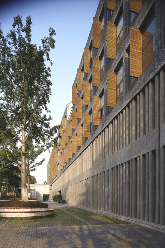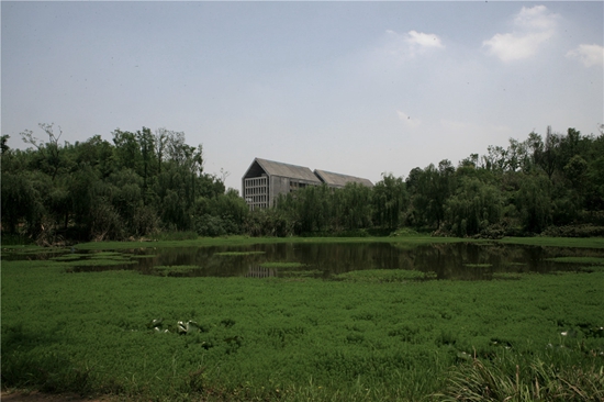 四川美术学院虎溪校区图书馆的设计立足于地域传统的乡土性,取材于重庆地方随处可见的建筑原型,如砖窑、仓库等,以简洁整体的形式屹立于山地中,与校园已形成的小体量分散布局的建筑物形成对比。地域精神的建筑形式与刻意保留和设计的农业景观形成有意味的关系;简明的体型在创造最大化的空间通用性的同时,也暗合了传统建筑空间的构成方式。