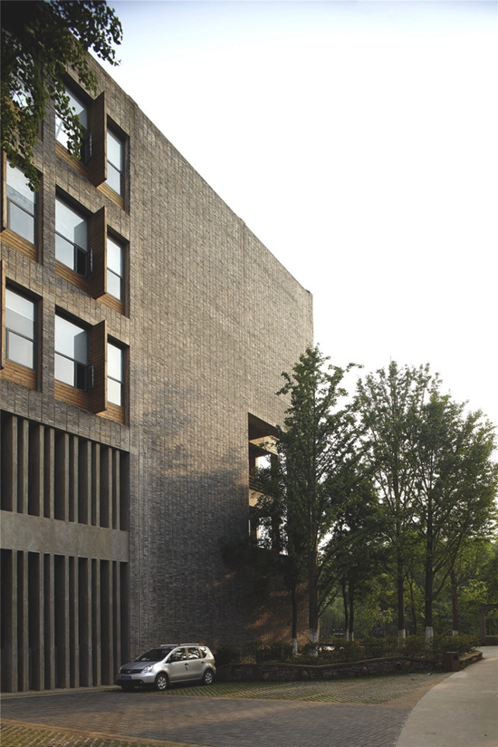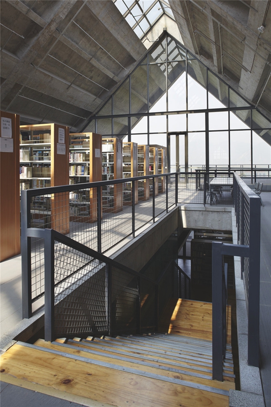 材料的选择除了依据其构造逻辑外,更重要的是考虑到历史逻辑。建筑主体的外表皮采用青色粘土砖叠砌,由屋面到墙身并一直延伸到广场地面。内部墙体及梁柱则采用清水混凝土,与外表青砖在色彩、质感上统一且具有变化。在外墙和内部楼梯间均使用了木材。建筑山墙面和空中花园四周则大量使用玻璃,以使图书馆内部活动能够清晰展示出来。