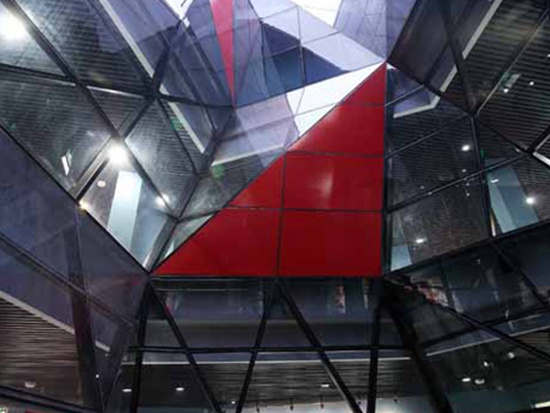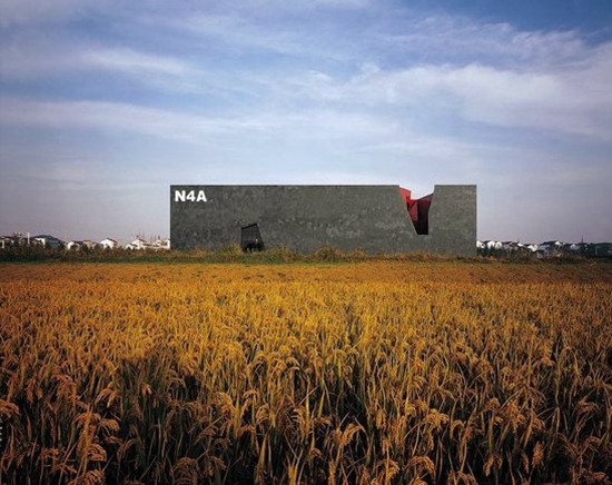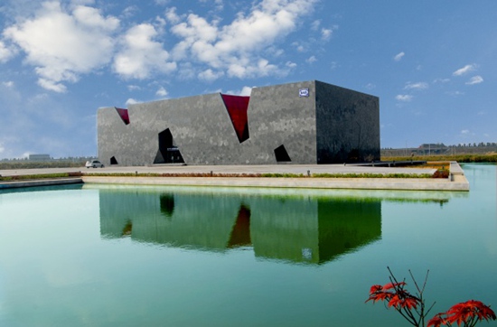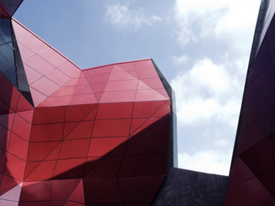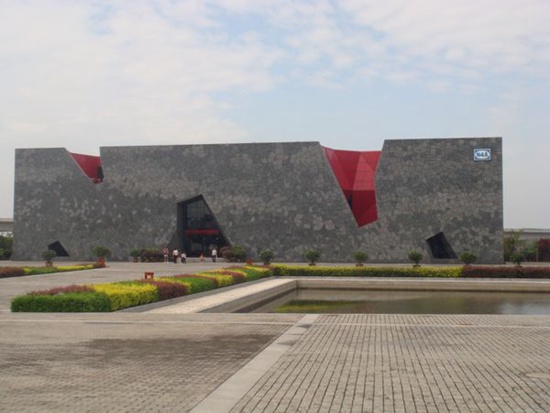新馆采用了与旧馆泾渭分明的空间塑造模式,首先,它是一个巨大的、综合性纪念广场规划的一部分,一个标准的人造物。相比旧馆,这一广场更像休闲娱乐的主题公园。其次,新馆采用了硬边几何体内向异型切割的处理方法。8m×8m的柱网,规则的框架体系,内部空间用一个100度的双折线区分开研究与展示两个部分。建筑师在其中各自挖出两个透底与半透底的空洞——用多个不规则斜面连接起来。它们在功能上起着院落的作用,乍看去,新馆像一块被凿去几个不规则凹洞的矩形花岗岩,或是虫子钻过的乳酪。第三,新馆的视觉要素完全符号化。几何母体表示建筑本身就是纪念物,石板贴面则象征着石碑的经典含义。用红色铝板做内桶的表皮象征着革命战争洒在山岩上的鲜血,也有铭刻历史的岩石的意象。而且,东面的几个凹洞把正立面用“N4A”三个字母给图解出来。第四,展示空间主题化。