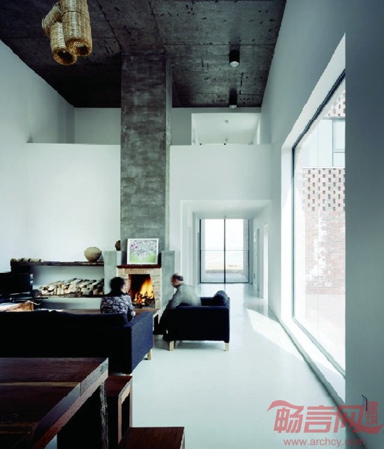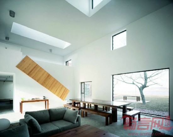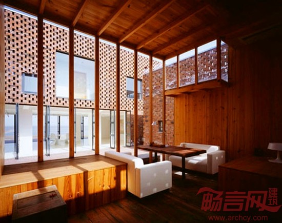 设计延续了“院落”的主题,“院落”体现在总平面和内部空间上,两幢房子内部空间各采用了三合院和四合院的布局,分别对应于西面及北面的湖面,虚空的部分分别被设计成前院、冥想院和天井等场所,并将几个连续而有层次的空间组织在一起。基地的开阔使得建筑的功能布置比较自由,直角空间、线形序列得到自然而然地运用,两幢住宅都尽量控制面向外侧的开窗,而内侧面对庭院和面向湖面则尽量开敞。在技术条件相对简陋的条件下,大量且连续的交流、交通、休闲、展示空间成为了建筑内部循环的主体,尽量增加非功能性空间的层次,增加视线贯穿和交换的密度。