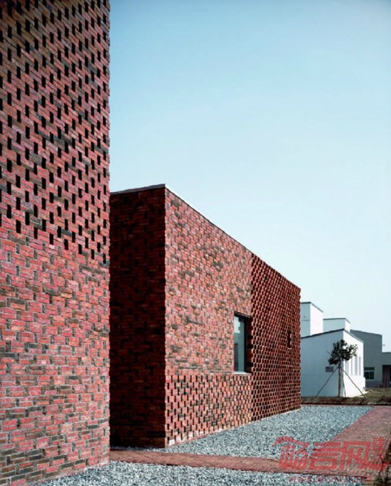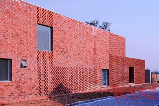建筑的外表是设计的重点:为强化其材料的地方性,建筑表皮全部用砖严实地包裹起来,每一处墙面都是空洞、砍半砖和凸半砖中2-3种砌法的混合,即用3种砌砖法进行立体主义式的抽象编织,3种密度的砖肌理和无规律的窗洞一起进行蒙德里安式的几何划分,而这一精确的几何划分,又揭示了无规律窗洞对于建筑外表面内在逻辑的规律性控制。