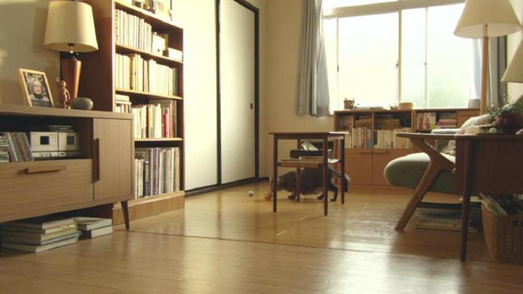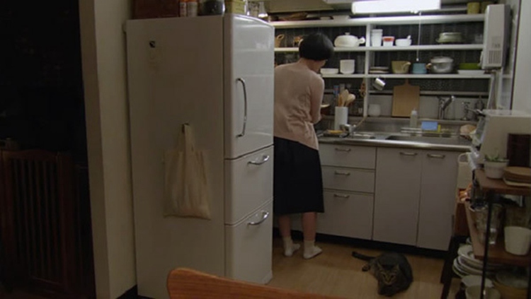 亚纪子将一楼作为自己经营食堂之用,二楼是自己的独居小屋。可以看出,整个客厅并不大,厨房为开放式,这大概是日本平时极少用“炒”的烹饪方式有关。墙壁有些微微泛黄,家具以原木色为主,沙发不大,刚刚好可以容纳两个人。