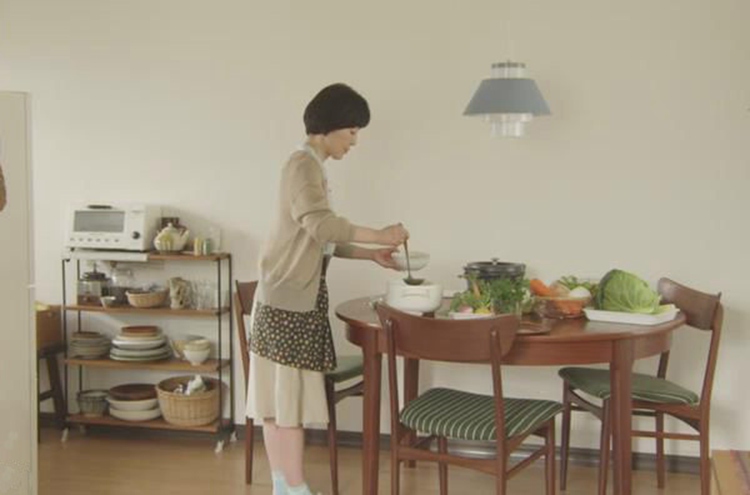 餐厅也以素净为主,一张桌子,几把凳子,再加上整齐摆放着餐具的落地架,简简单单。独居的纪子,在这里与美食作伴,也是一番好滋味。