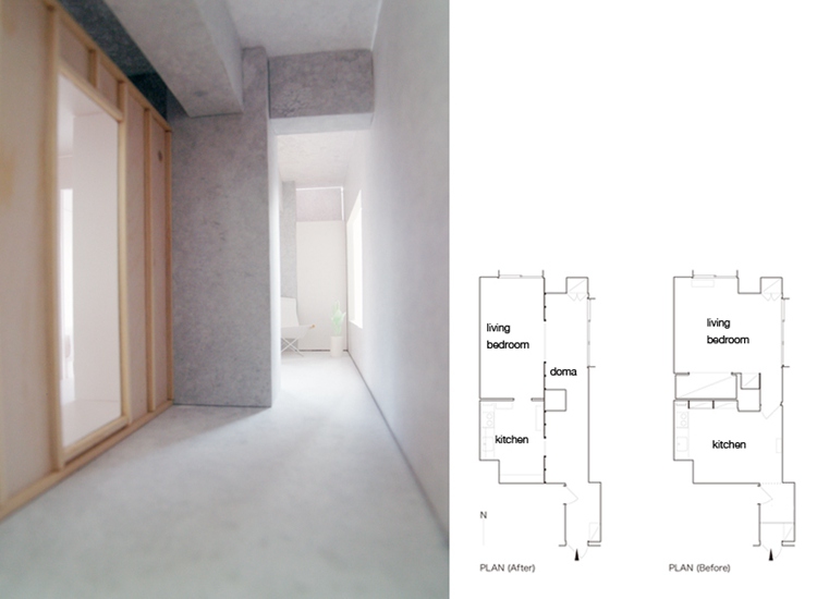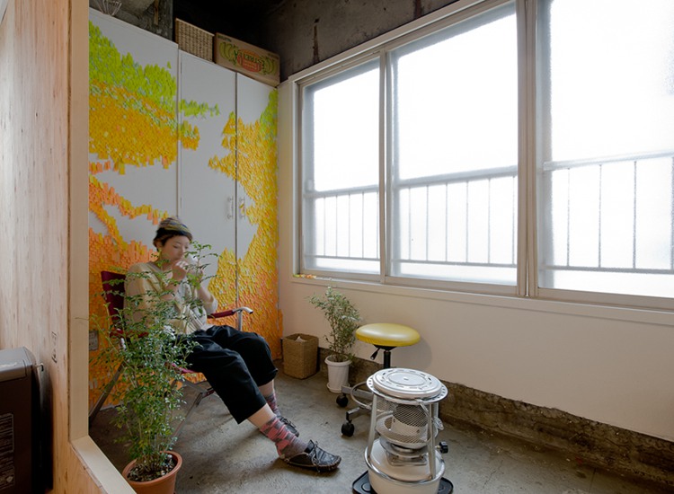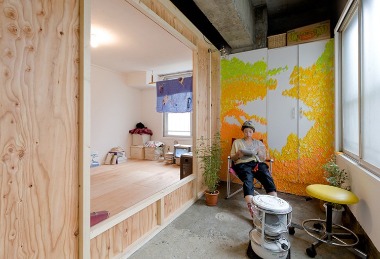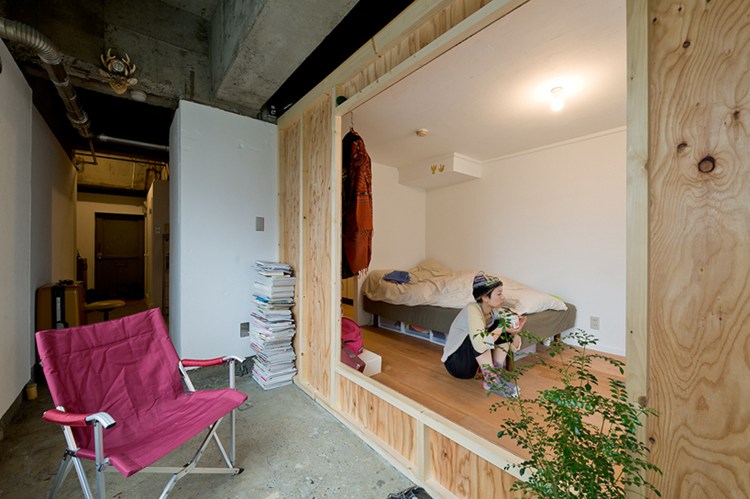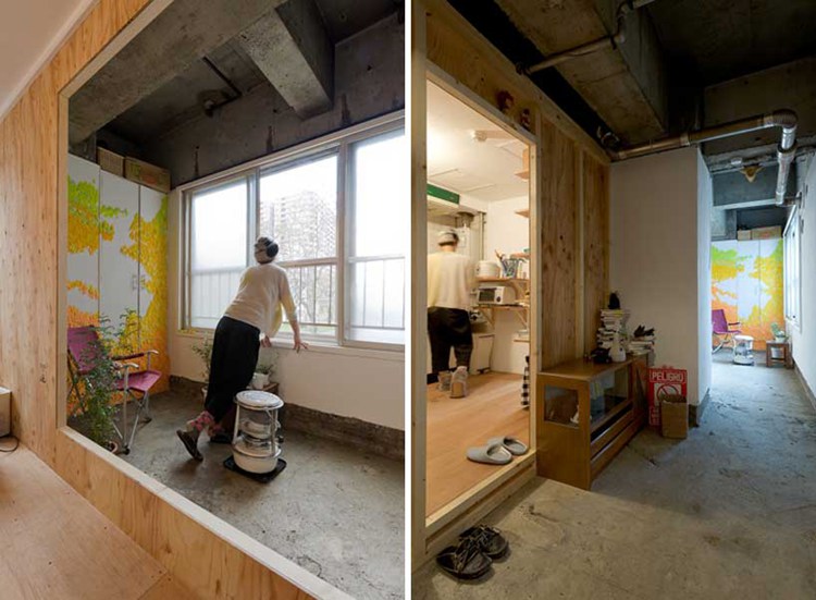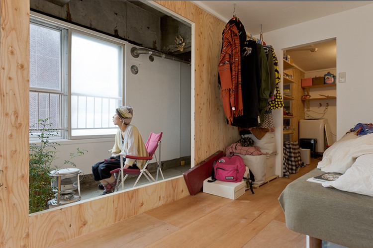 设计师用胶合板隔墙将一个大房间划分为两个小房间,其中一个作为传统日式房间,另一个则设计成带木地板的起居室。日式房间中的所有饰面材料、天花板和地面都是裸露的,给人一种仿佛置身于庭院中的感觉。与其它空间相隔绝,在材质与空间性上也形成对比,这个未经加工的区域将作为居住者和室外沟通的空间,用作朋友聚会或闲暇放松。设计师将这间公寓作为外部环境的延伸,配备了许多室外座椅、植物和房屋固定装置。