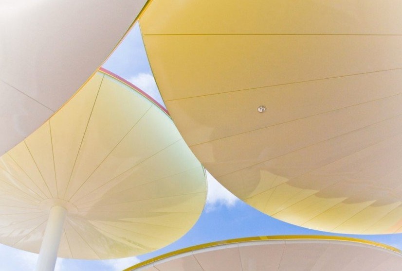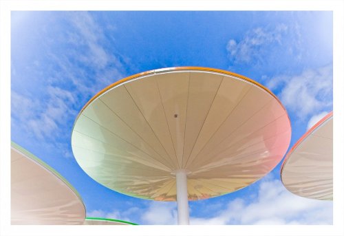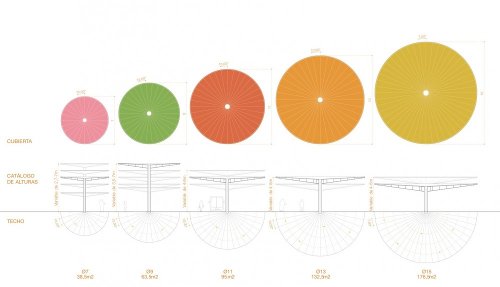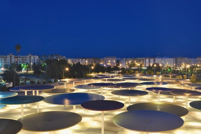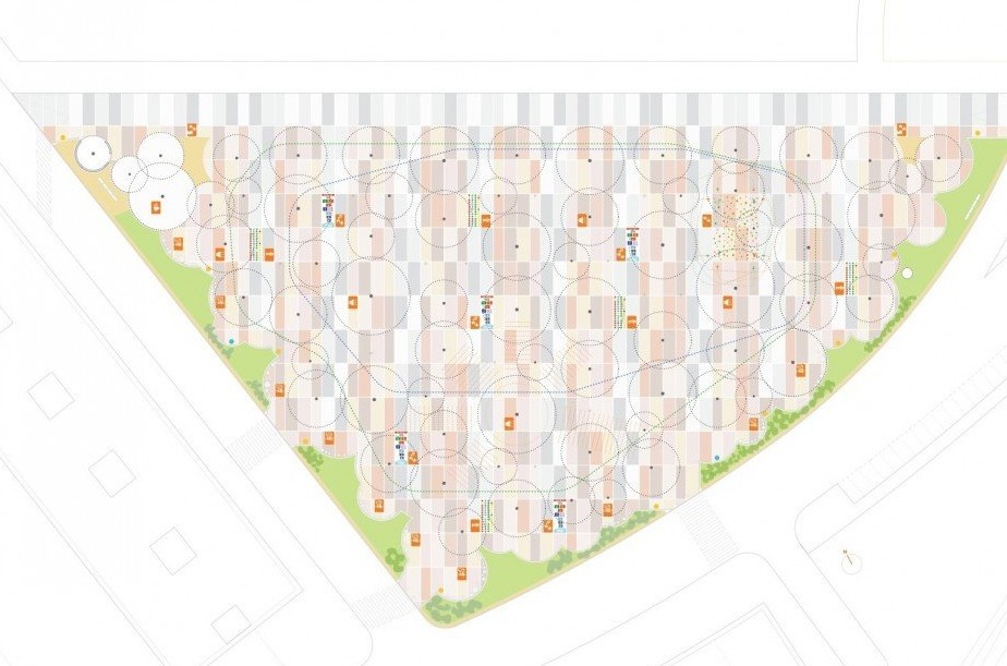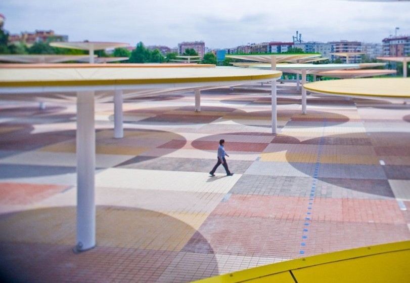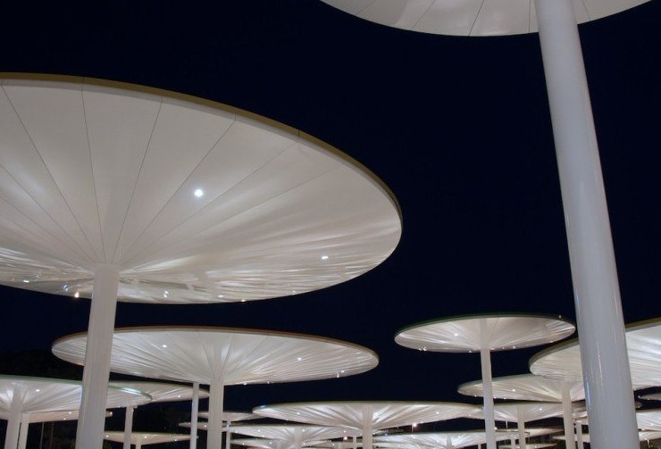 整个项目由高度和直径都不尽相同的预制圆形构筑物组成,灵活随意的排布方式给人一种似曾相识的城市森林下阴影的感觉。这些太阳伞结构在解决了人工照明的同时,也实现了内部排水。