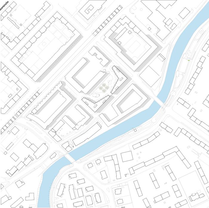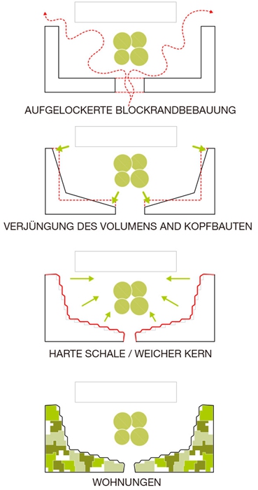 坚硬的外壳—柔软的核心:Sillblock住房开发设计主要着力点在于从庭院中清晰区分街道空间。街道正面,U形街区边缘开发故意不惹人注意地与周围城市空间相融合,在内部,它分为两个尖端细的部分,限定了欧椴树周围引人注意的新庭院。