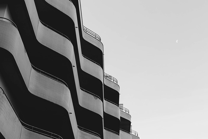 居民区的“两面”也倒映在各自外观的重要性和正式风格上。所有的公寓楼都面向庭院,两侧是“阳台场地”—由起伏状暴露的混凝土护墙描述。这一住宅楼的特殊性质在于建筑平面的多元化和灵活性。