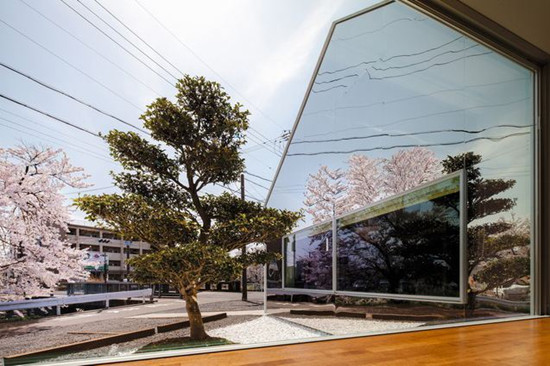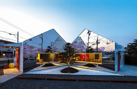 位于日本岐阜县的这间咖啡厅设计上非常有特色,路过这里不留神的话还以为这块的空间发生了扭曲,莫非出现了虫洞?细看才发现原来是建筑的两个山墙面采用了完整的镜面材料,只有靠近下面的一段开窗仿佛浮在半空,给人穿越的感觉。