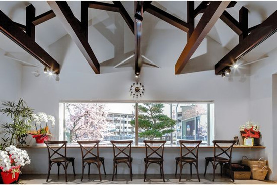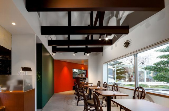 咖啡厅的室内设计则保持了简洁明快的风格,深咖色木桌椅和屋顶的木支架相互呼应,墙面则以纯白为主,并用对比鲜明的红色和绿色打破单调,增加明快感。