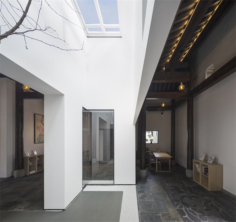 建筑师企图在古建修复和空间创新中寻求一种平衡。对于留耕堂旧建筑部分,建筑师采取了克制的设计态度,尽最大的可能性保持徽州古宅的空间精神。与此同时,通过对正堂、天井、楼梯、餐厅等公共空间的改造,达到民宿功能的舒适性。此外,在局部位置,以可逆方式置入新材料、新形态,活跃空间气氛,形成新老对话。