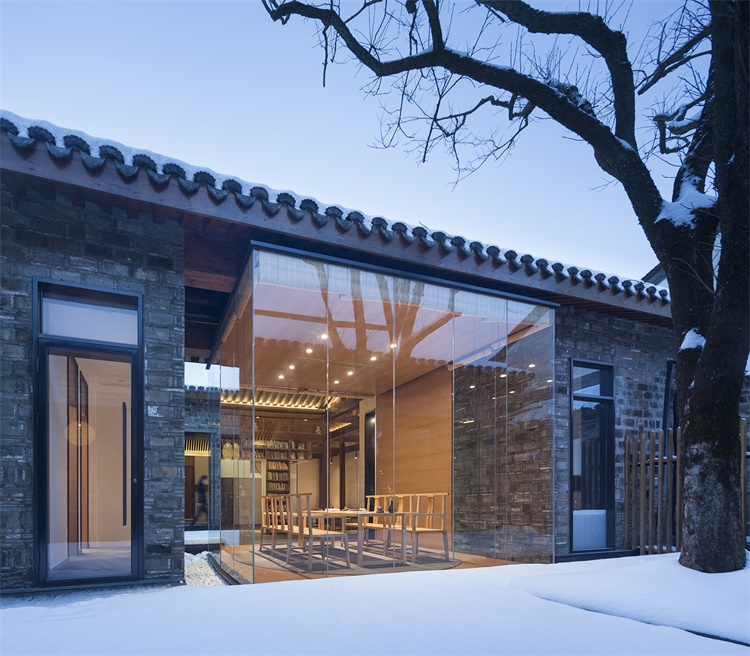 老宅改造是更新计划的重点所在。设计最大限度的保留了这栋村中少有的古老宅院的外在形态,希望能强调地域特征和文化传承的重要性。同时对建筑内部进行颠覆性的功能置换和空间重构。包裹着天井的书架和一个面向庭院的玻璃茶亭植入其中,它们不但成为了空间活动的中心,更是打破了室内外的界限,为原本昏暗老宅引入了阳光和自然,使其成为了村庄邻里交流和文化交融的新场所。