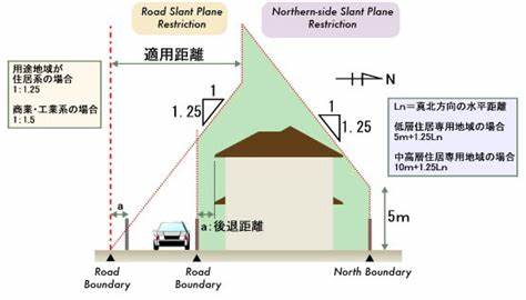日本《建筑基准法》56条的“日影规定”限制了新建房屋用地边界以外区域产生的阴影时间,最低标准是冬至日2-5小时。