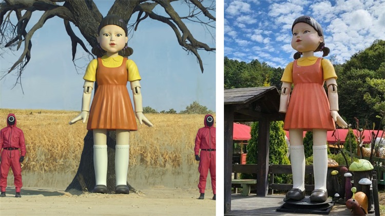 游戏中最令人难忘的元素无疑是巨大的娃娃机器人。他在致命的“红灯绿灯”游戏(或者叫做“狼先生几点了”)中扮演指挥的角色。玩偶本身具有建筑物的体量,摄像机代替眼睛,唤起监狱及高安全配置政府设施监控装置的既视感。玩偶令人生畏的规模大小,也让玩家的身形变得像孩子一样渺小,这一主题贯穿于全剧。