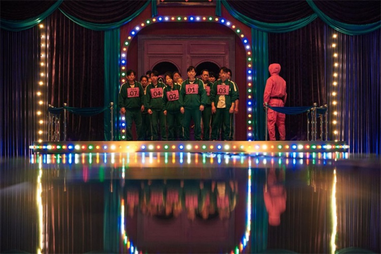 拔河游戏在《鱿鱼游戏》中最大的竞技场进行。像巨大的飞机吊架,房间带有原生态和工业属性。两座巨大的建筑支撑着高高的平台,两组队员站在上面,竭尽全力地拉着绳索,以避免落入中央的空隙。当然,结局不可避免导致:只有一半人会活着离开这个空间。幕后蓝屏在后期制作中增强黑暗感和眩晕感。