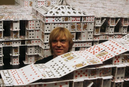 美国建筑师贝格成功打破自己之前保持的“世界最大型扑克牌建筑”的吉尼斯世界纪录