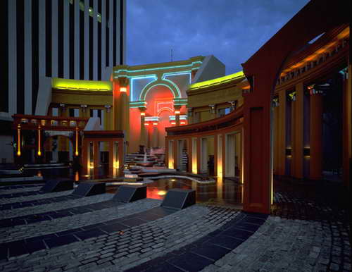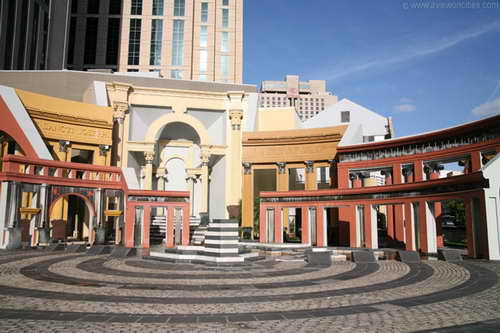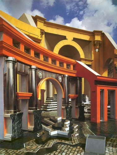 新奥尔良是美国南方城市。1973年,市政当局决定在该市意商居民集中的地区建造意大利广场。意大利广场中心部分开敞,一侧有祭台,祭台两侧有数条弧形的由柱子与檐部组成的单片“柱廊”,前后错落,高低不等。这些“柱廊”上的柱子分别采用不同的罗马柱式,祭台带有拱券,下部台阶呈不规则形,前面有一片浅水池,池中是石块组成的意大利地图模型,长约24米。新奥尔良市的意裔居民多源自西西里岛,整个广场就以地图模型中的西西里岛为中心。广场铺地材料组成一圈圈的同心圆,即以西西里岛为中心。广场有两条通道与大街连接,一个进口处有拱门,另一处为凉亭,都与古代罗马建筑相似。广场场上的这些建筑形象明确无误地表明它是意大利建筑文化的延续。