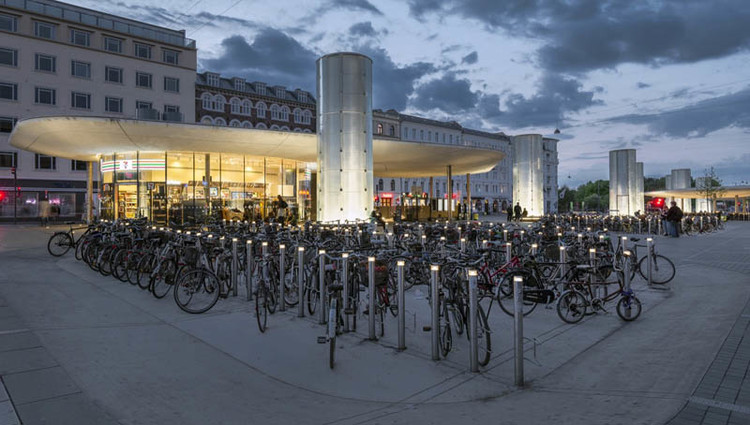 站前广场被设计成了一个扩大的城市“地面”,并且建造了人行通道可以直接从周围的步行区通往站前广场,而过往的车辆的线路重新布局,只留下一条车站北面的交通干道。在站前广场上设置了2100辆自行车停车位,被称为“自行车床”,这是一排凹陷进去的装置,自行车可以放在里面,颇为隐蔽。这也是为了设计出一个清晰的层次结构,并能够让空间看上去是一个整体。