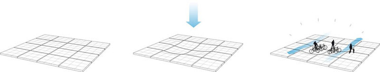 这种富有凝聚力的空间是没有后背或角落的。它的布局和站前广场的自行车停车场是根据周边交通的人流量来设计的,人们从这里穿过站前广场或是下台阶到车站里面去。