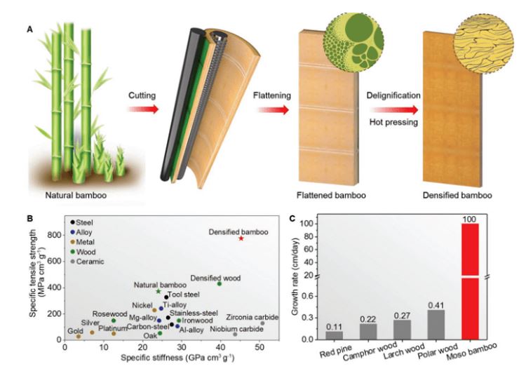 除了透明木材,胡良兵教授等人还设计了一种简单而有效的自顶向下的方法,将天然竹子加工成一种重量轻但强度高的散装结构材料,其抗拉强度高达1 GPa,韧性为9.74 MJ/m 3 。竹子的密度是由部分去除其木质素和半纤维素,其次是热压,长而整齐的纤维素纳米纤维显著增加了氢键,大大减少了竹材结构的结构缺陷,使竹材具有较高的机械拉伸强度、弯曲强度和韧性。