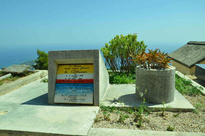 站在柯布的墓前,不远处的山下是蔚蓝的地中海——柯布的墓实际上是背对大海的,而瞻仰的人则是面朝大海。这就是柯布的墓,朴素之极,朴素得让人震撼不已。在地中海强烈阳光下的纯粹的几何体,没有任何矫饰,如同他的每一座建筑,而柯布的遗体就在下面,你仿佛可以看见柯布的灵魂,在与你对话。这是我所见过和知道的最令人难忘的墓,你难以想象那个20世纪最伟大的建筑师,那个曾度过波澜壮阔的一生并影响世界的人,就埋葬在这里,这小小的方寸之地,无声无息。